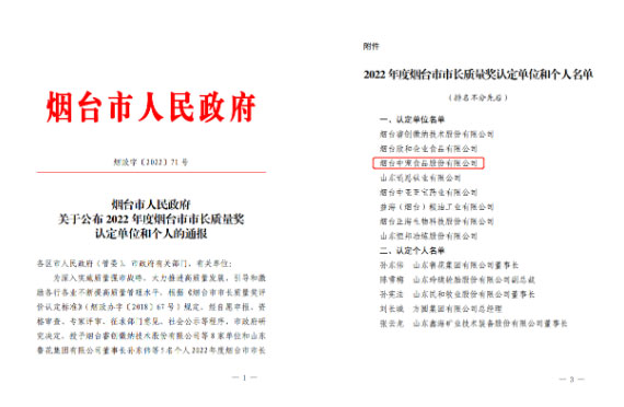 2022年度烟台市市长质量奖认定单位和小我私家名单
