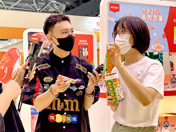 展台的产品摆设、现场运动以及颜值超高的品牌好物周边,都吸引了合作伙伴和消耗者的热情互动。同时,现场不少达人及行业媒体也现身展台,以线上直播的形式向导粉丝们云逛亚宠展。